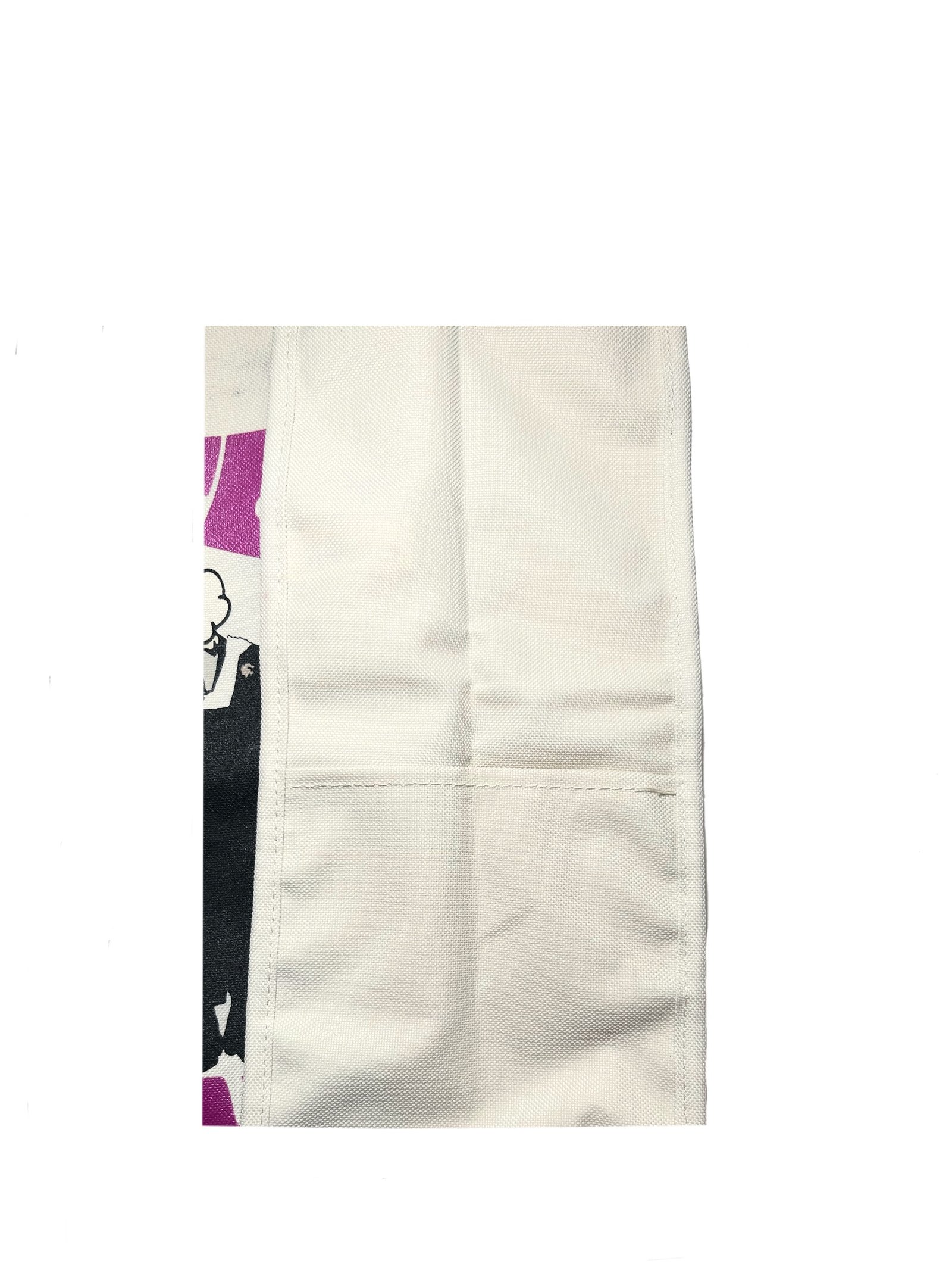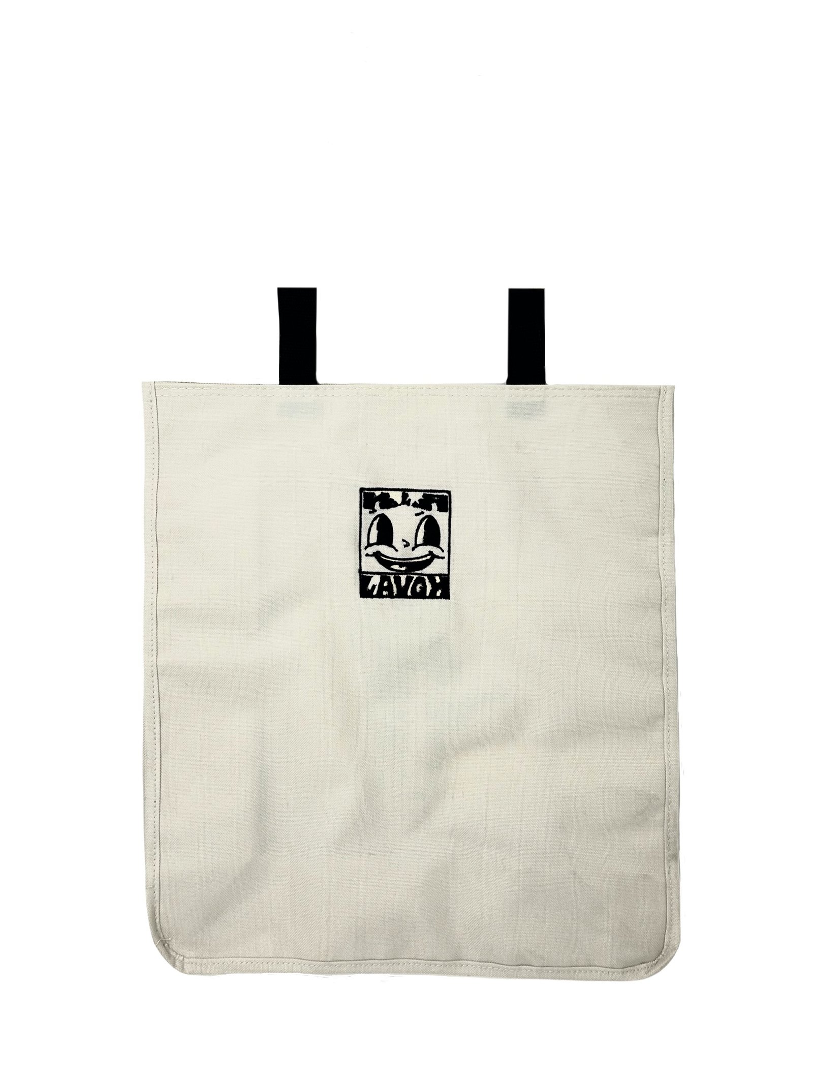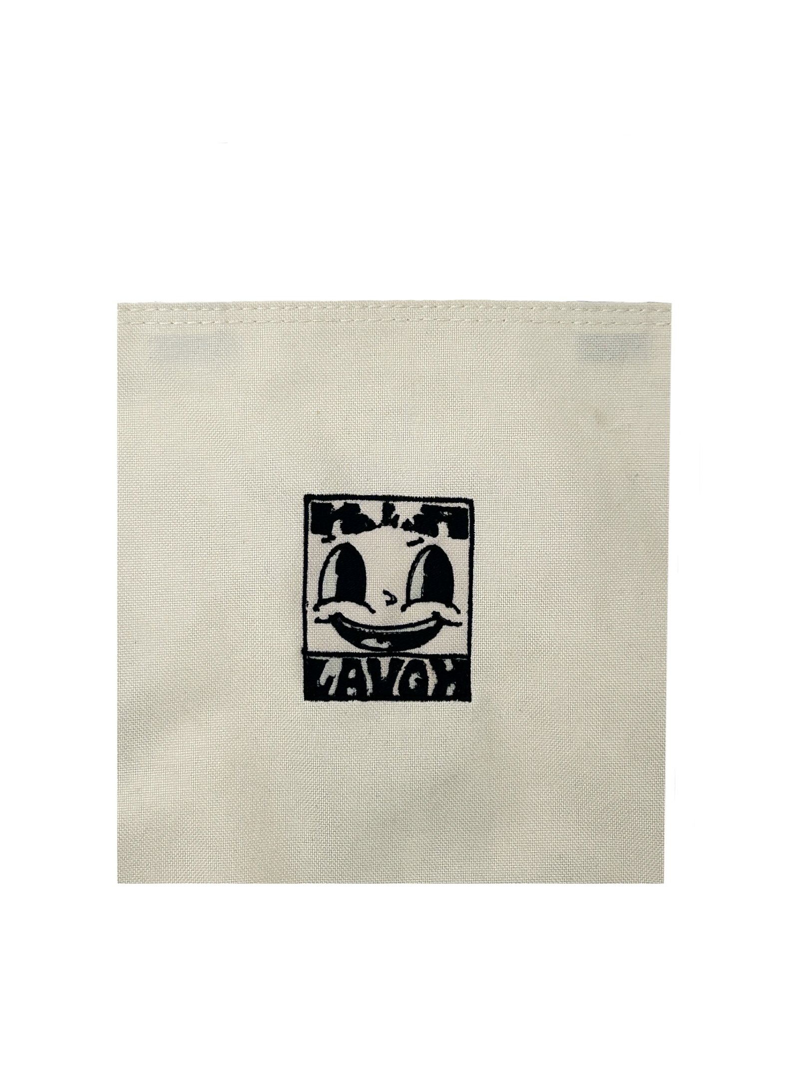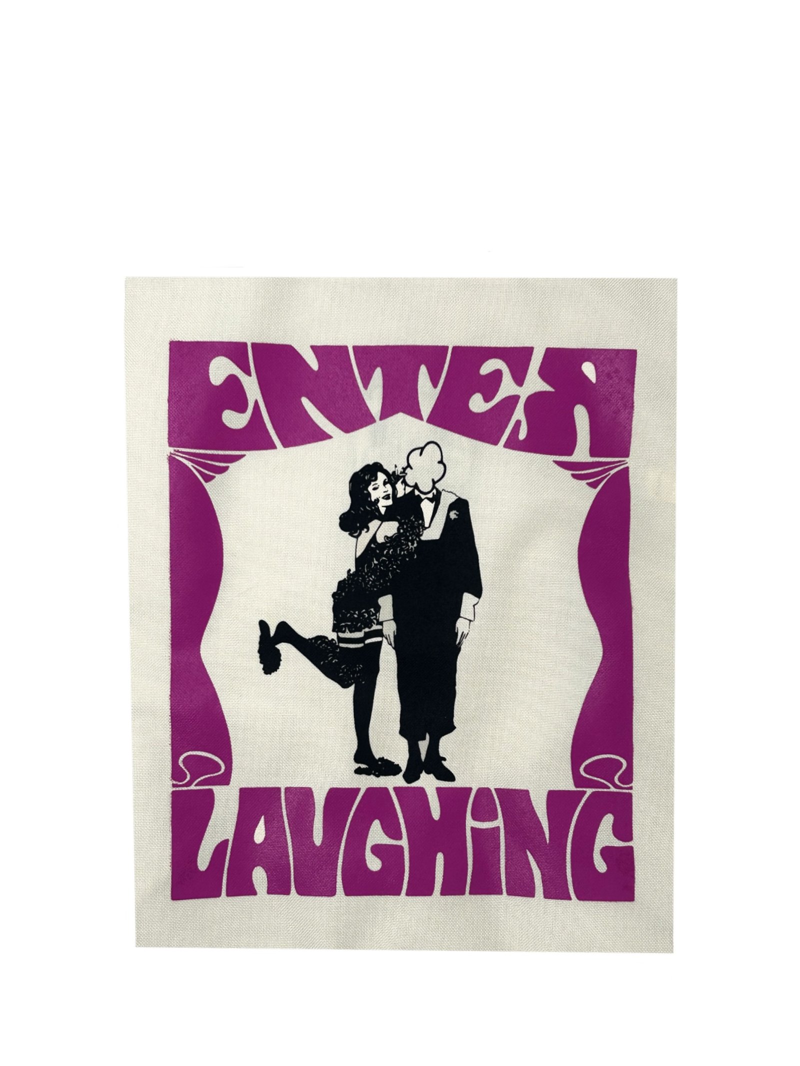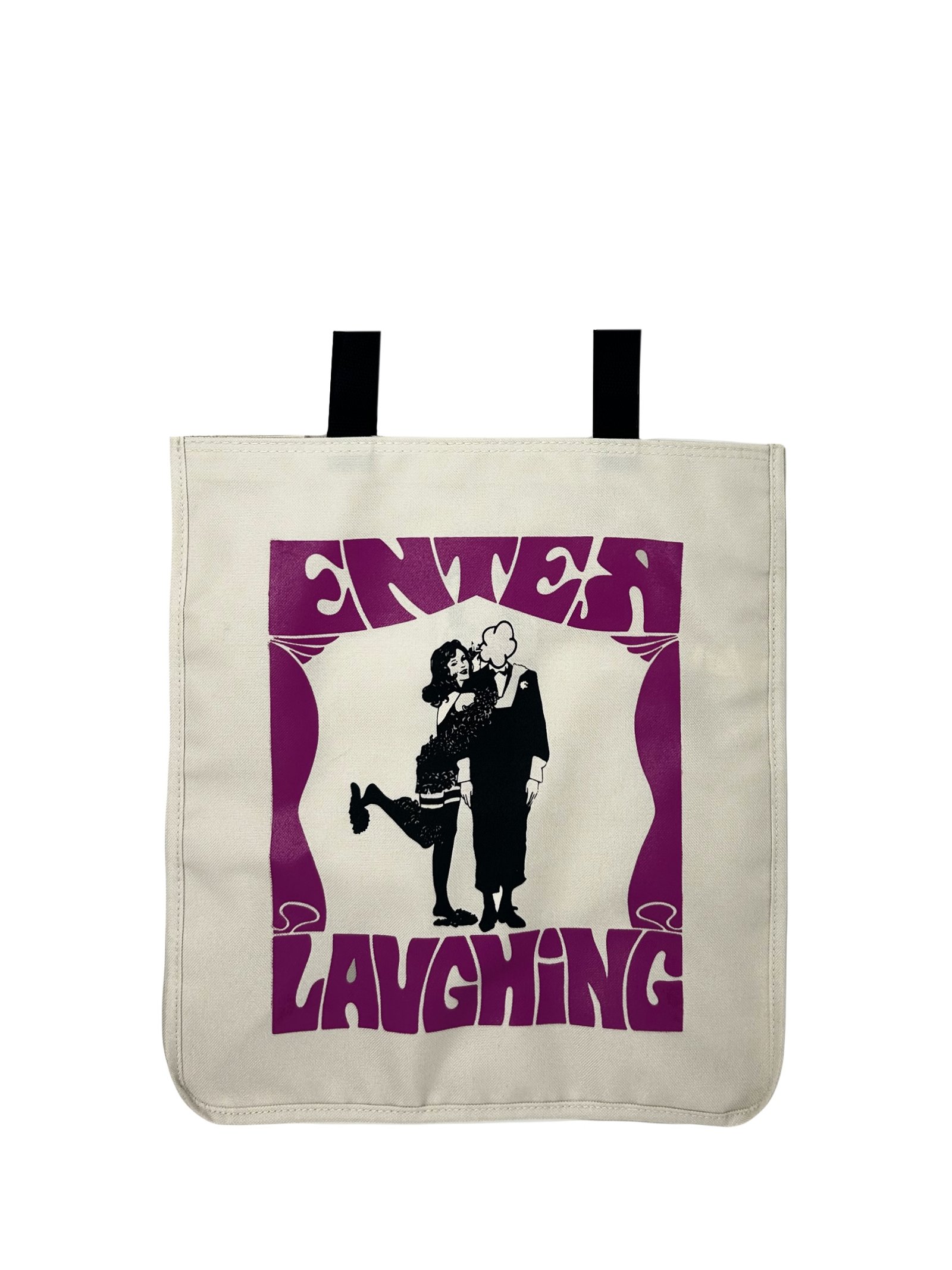 A white tote bag featuring the “Enter laughing” design on the front side and an embroidered smiley on the back side of the tote, also having a side pocket on the left hand side.